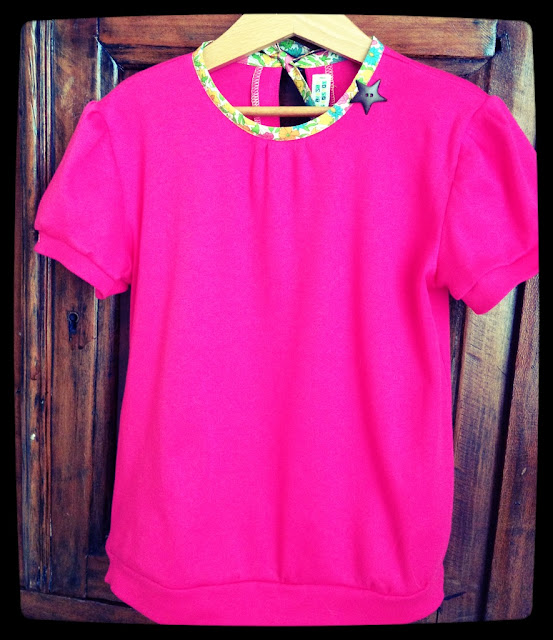 Comme la collec printemps-été a démarrée, je voulais faire un petit t-shirt à Miss Pépin dans un jersey fushia qui flashe.